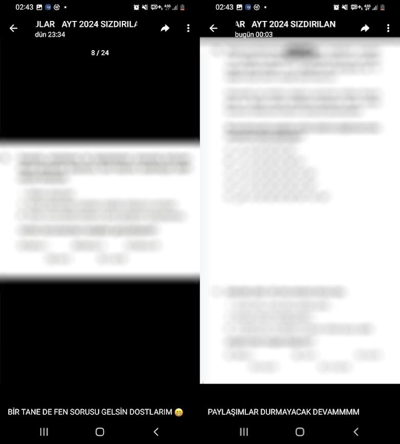 Yurt dışı kaynaklı olduğu düşünülen “AYK 2024 Sızdırılan Sorular” diye başlık da açılan Telegram hesabı link de yayımladı. Soru paylaşan hesap ya da hesaptaki şahıslar, adaylara, “Gençler tüm AYT sorularının soru ve cevaplarıyla birlikte sadece fiyatı 3 bin TL. Eğer sınavda başarı göstermek istiyorsan aşağıdaki linkten ulaş” diye çağrı da yaptı.